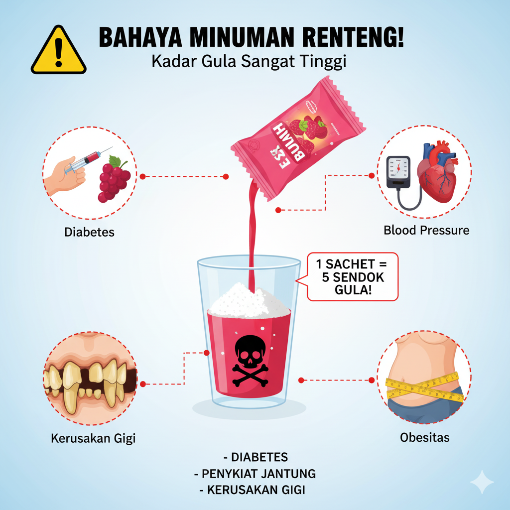 Minuman renteng seringkali mengandung gula dalam jumlah yang sangat banyak. Gula berlebihan ini dapat memicu berbagai masalah kesehatan serius jika dikonsumsi secara terus-menerus.